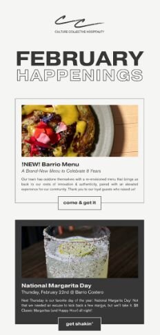 "We send an email every Wednesday. I alternate between Cul+ure or a restaurant brand," Dana explains. This approach allows them to showcase their overarching brand while also highlighting individual restaurants.