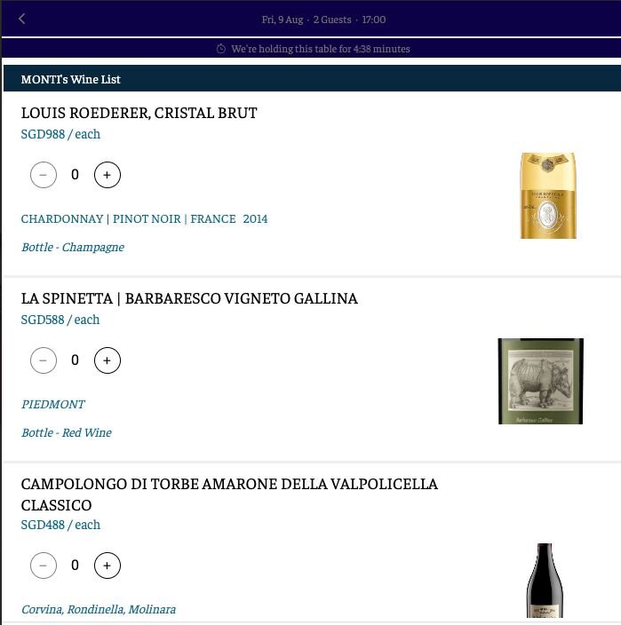 Using the SevenRooms booking widget, Italian restaurant, MONTI, encourages guests to toast in style by promoting selections from their wine and bar list, which they can choose to have chilled and ready for drinking upon arrival.